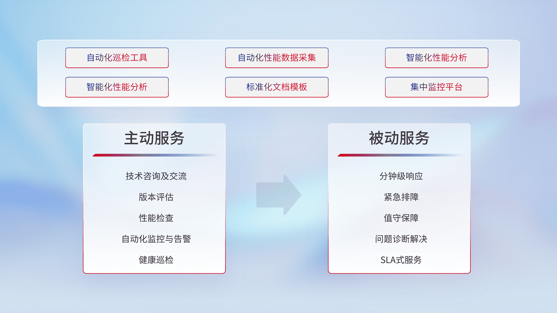智能化工具和标准化文档,,保障服务质量,,,提供主动服务(包含技术咨询、、、版本评估、、、、性能检查、、、自动化监控与告警、、健康巡检)和被动服务包含(分钟级响应、、紧急排障、、值守保障、、问题诊断解决、、、、SLA服务)。。